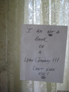 All my life my mom has warned me of the highly possible chance that I may end up in a mental institution.  A matter of fact, I think she has told me twice this week.  She thinks I’m nuts.   I blow her off.  My mom on the other hand, thinks she’s sane.  I asked her if she realized that when I do end up in a mental institution, they will blame her.  I mean can’t we always blame our moms for screwing us up??  It seems to be catching on in society these days.  This sign is currently taped to my mother’s front door.