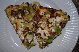 Jason and I made a pizza. This was a first for me. We didn’t make our own crust however, we cheated and bought a pre made one. We used a recipe by The Pioneer Woman found in her cookbook. It is called Leek and Potato Pizza. It sounds atrocious I know.