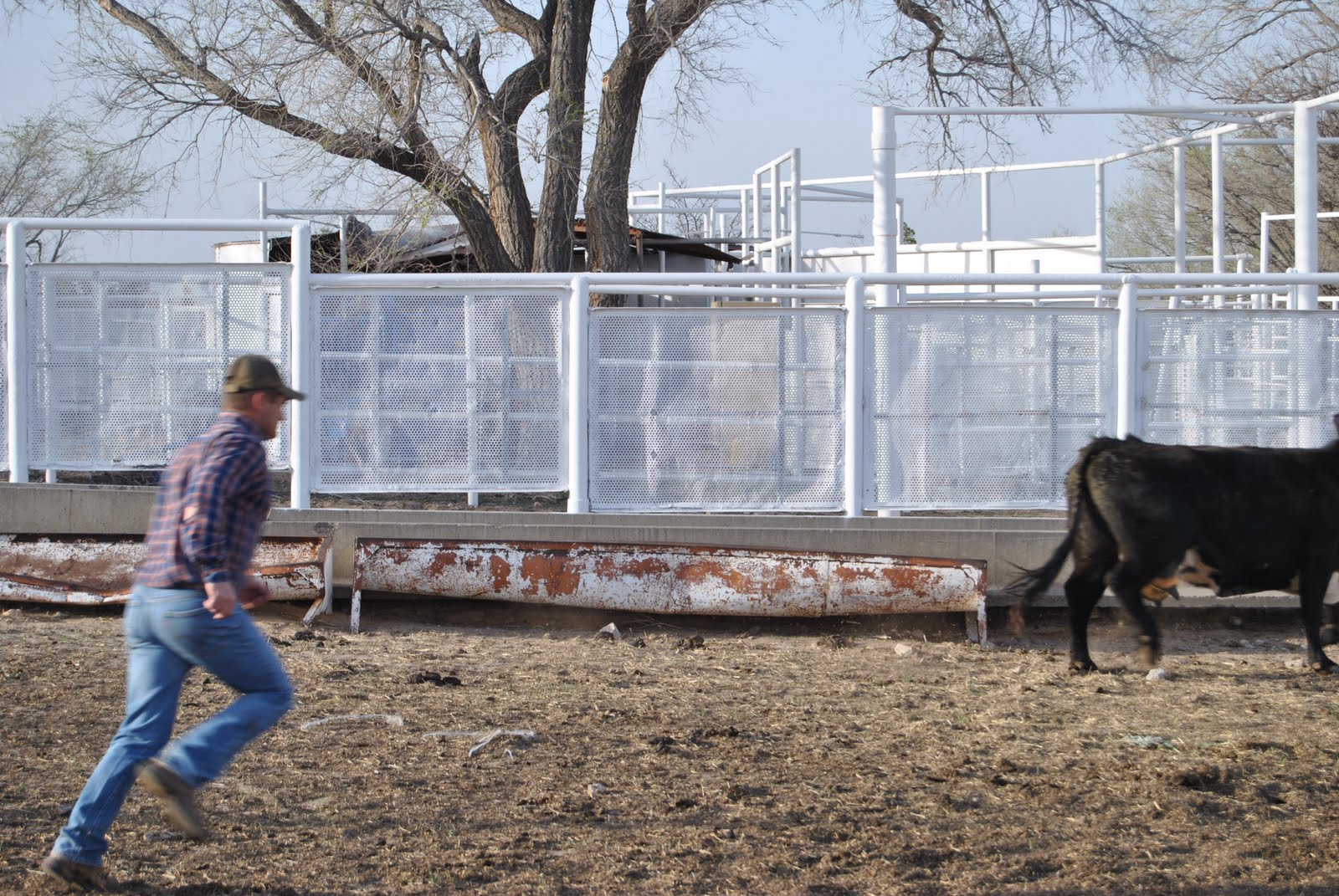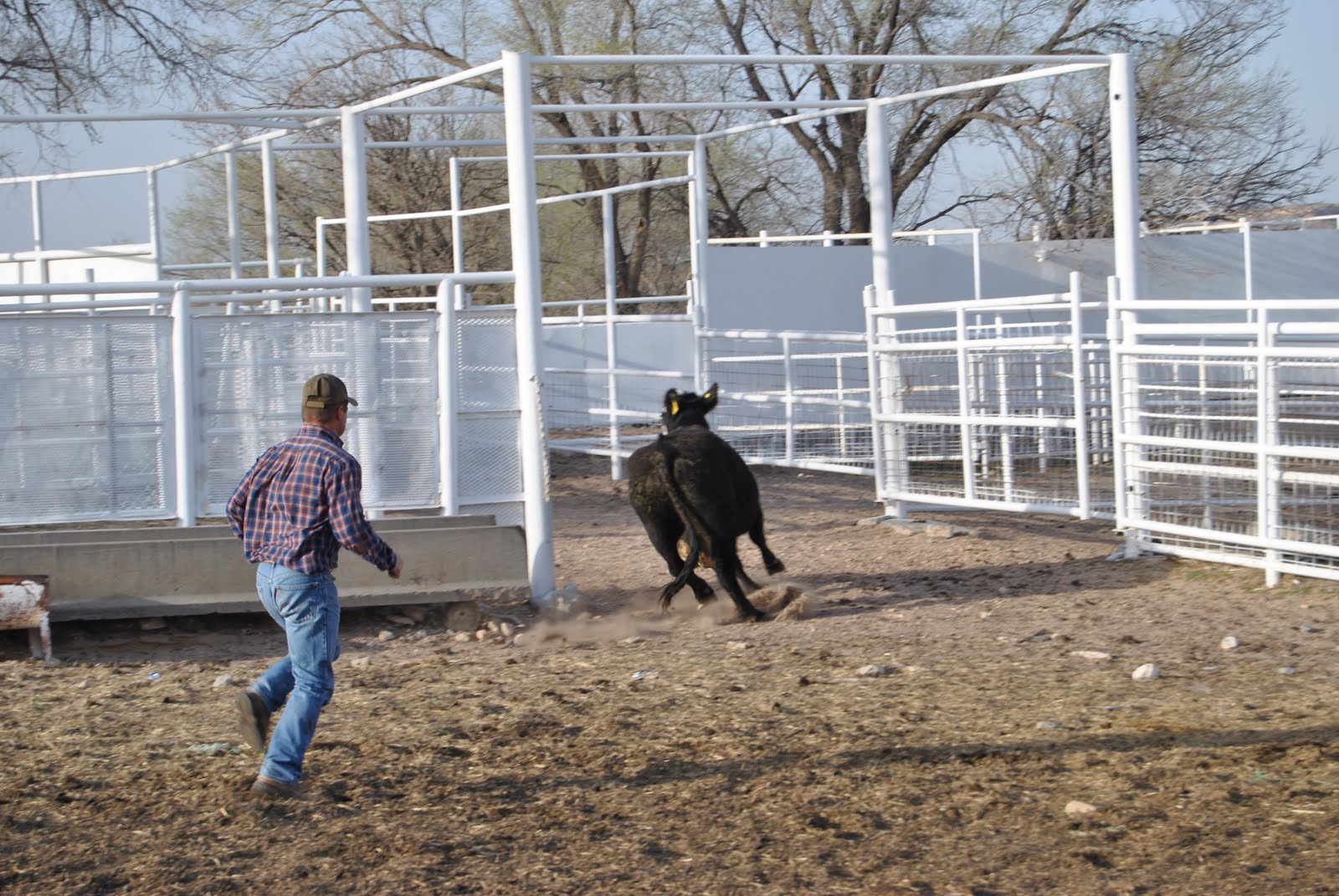 After penning the cow and calf, he runs the big bagged momma into a squeeze chute.