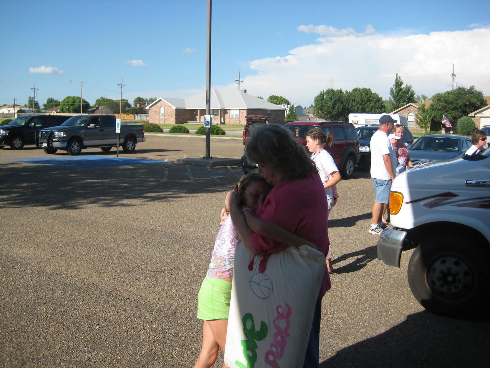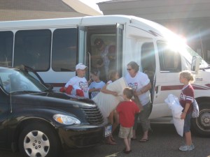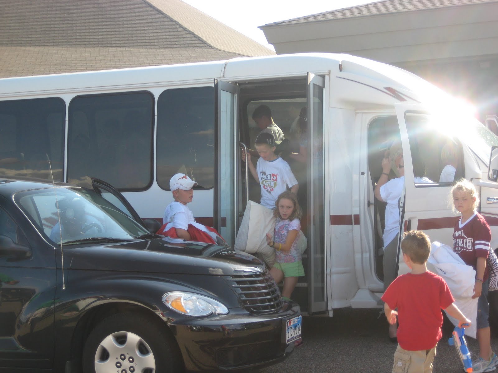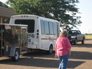 Then the moment arrived.  Grand was the first one to arrive at the church to meet the bus.  The bus pulled into the parking lot with loud music blaring and children singing and shouting.