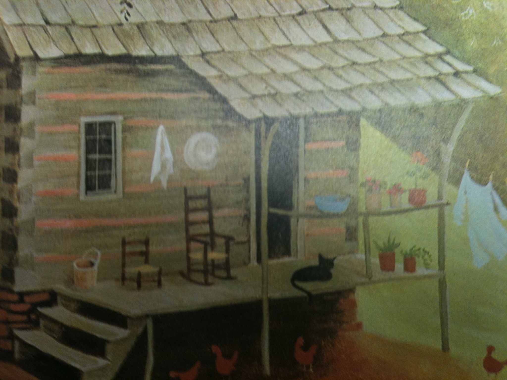 Rocking chairs, cats, and chickens scratching in the yard.