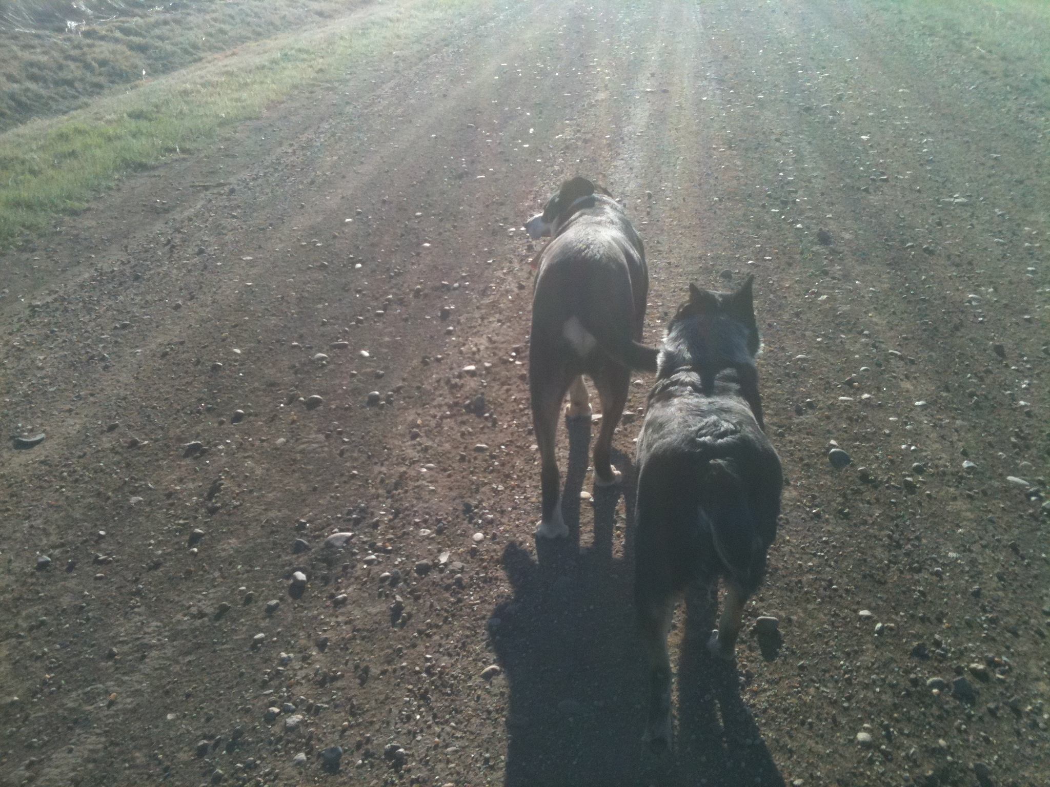Here they are walking with me yesterday. They’re fat and need the exercise. It has absolutely nothing to do with the fact that my jeans are cutting off my circulation and that I give out chasing chickens.