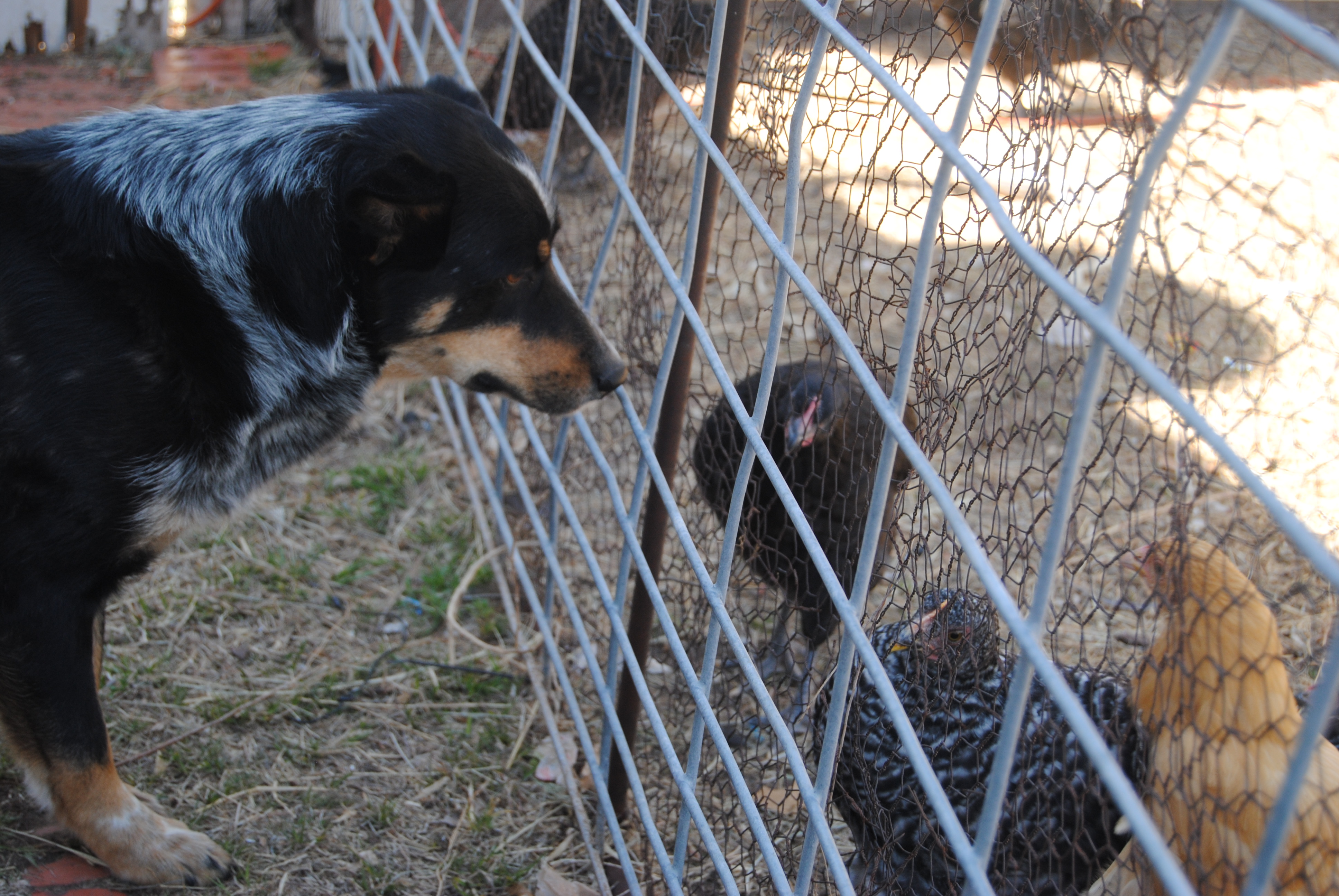 She won’t break eye contact with the chickens.  She watches their every move.  I think if given the opportunity, she might kill my chickens.  J-Dub says she will only chase them.