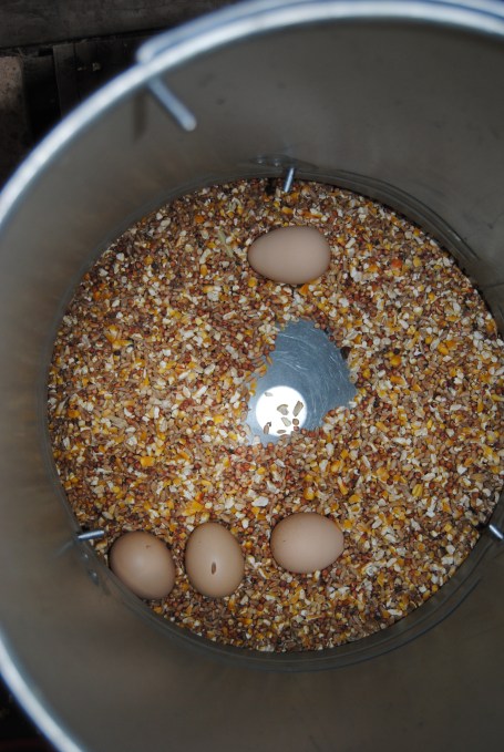 Yup, eggs. In the feeder. Our very first crop, if that’s what you call it. I had been checking for eggs daily, but foolish me, was looking in the nesting boxes, not in the chicken feeder.