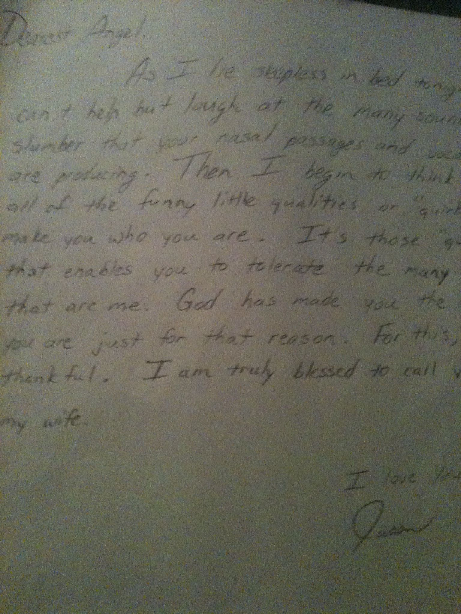 As I lie sleepless in bed tonight, I can’t help but laugh at the many sounds of slumber that your nasal passages and vocal cords are producing. Then I begin to think about all of the funny little qualities or “quirks” that make you who you are. It’s those “quirks” that enables you to tolerate the many “quirks” that are me. God has made you the way you are just for that reason. For this, I am thankful. I am truly blessed to call you my wife.