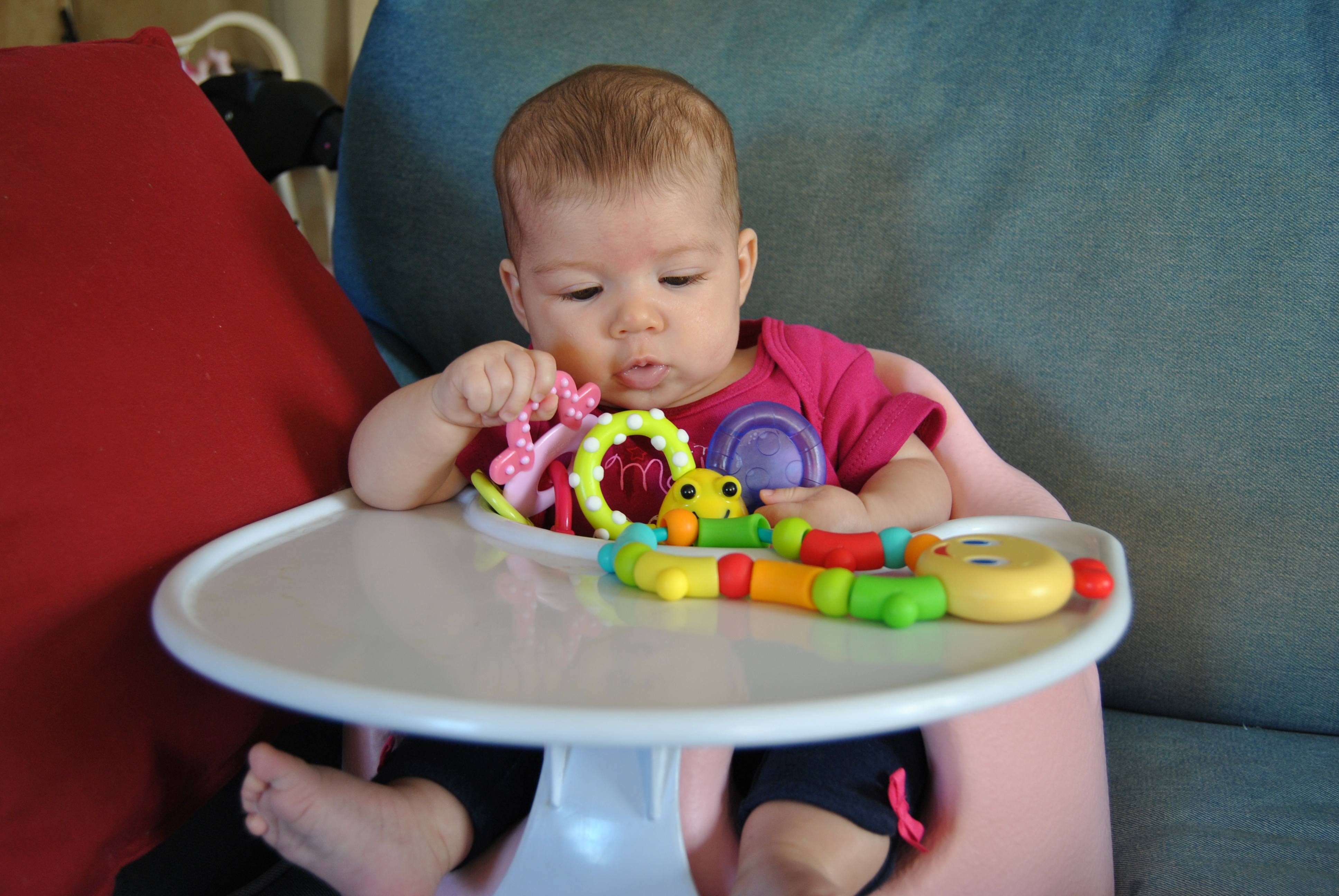 You are reaching and grabbing now. You hold onto my shirt while nursing, you hold on to your clothes if you can get them. You try to help put your pacifier in your mouth, which I think you are becoming much too fond of, by the way! You’ve started grabbing fistfuls of my hair and I have to pry your little hand loose. I’m careful not to wear dangly earrings around you for fear of the pain you may cause when you grab ahold and yank.