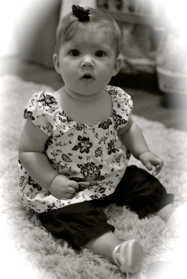 For a while now you’ve been belly crawling, but this month you decided to try out the old hand and knee crawl.  It’s still a bit clumsy, and you really only do it when you don’t have a shirt on.  I don’t think you like the feel of the hardwood on your belly.  But you still prefer the “wounded soldier” crawl and drag one leg behind you.  You’re pretty fast at it too!  You certainly don’t let many things stop you either, that’s why your daddy calls you his little 4 X 4.  It’s so fun watching you explore your new world, and learning to be so independent.