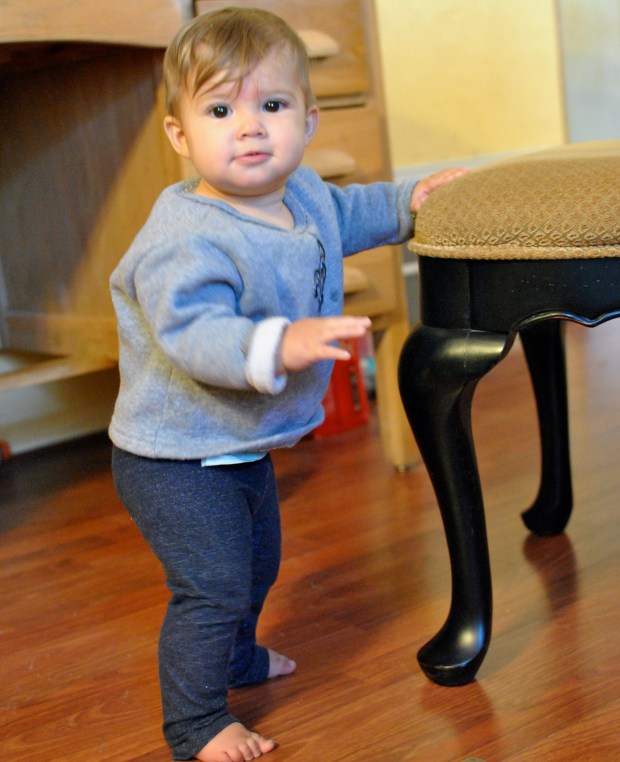 Pulling up has become old hat to you now, and just this week you’ve started standing alone for longer periods– like about 8 seconds. Might not be sound long, but it is when you’re balancing huh baby? Or riding a bull, which you will never ever attempt, just so you know. I just felt like we needed to get that established right here and now. You walk all around holding on to things, like the couch, the end tables, your crib. Just like what you’ll do in the swimming pool in a few years. You love to explore and you climb the porch steps up to the door.