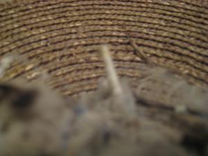 The female seems to have the bit of feather stuck in the side of her beak. Hung in her eyeteeth, as it were. All she would have to do is put one of her tiny bird feet on the feather, rear her head back and she would be free of the bit of clinging fluff. The male, impatient to begin construction on the nest mutters under his breath, trying to hurry the female along.