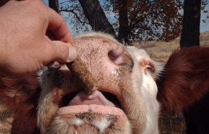 They must’ve been cows in their former lives because they got in the cake line and helped themselves. Most of the bovines ignored them and went about their business eating. But a few calves did not appreciate these welfare cases. They head butted over cake. Not sure where these univited guests journeyed from. I asked Jason to get me a picture if he can. Until then, here is a very tame cow eating a piece of cake from Jason’s hand.